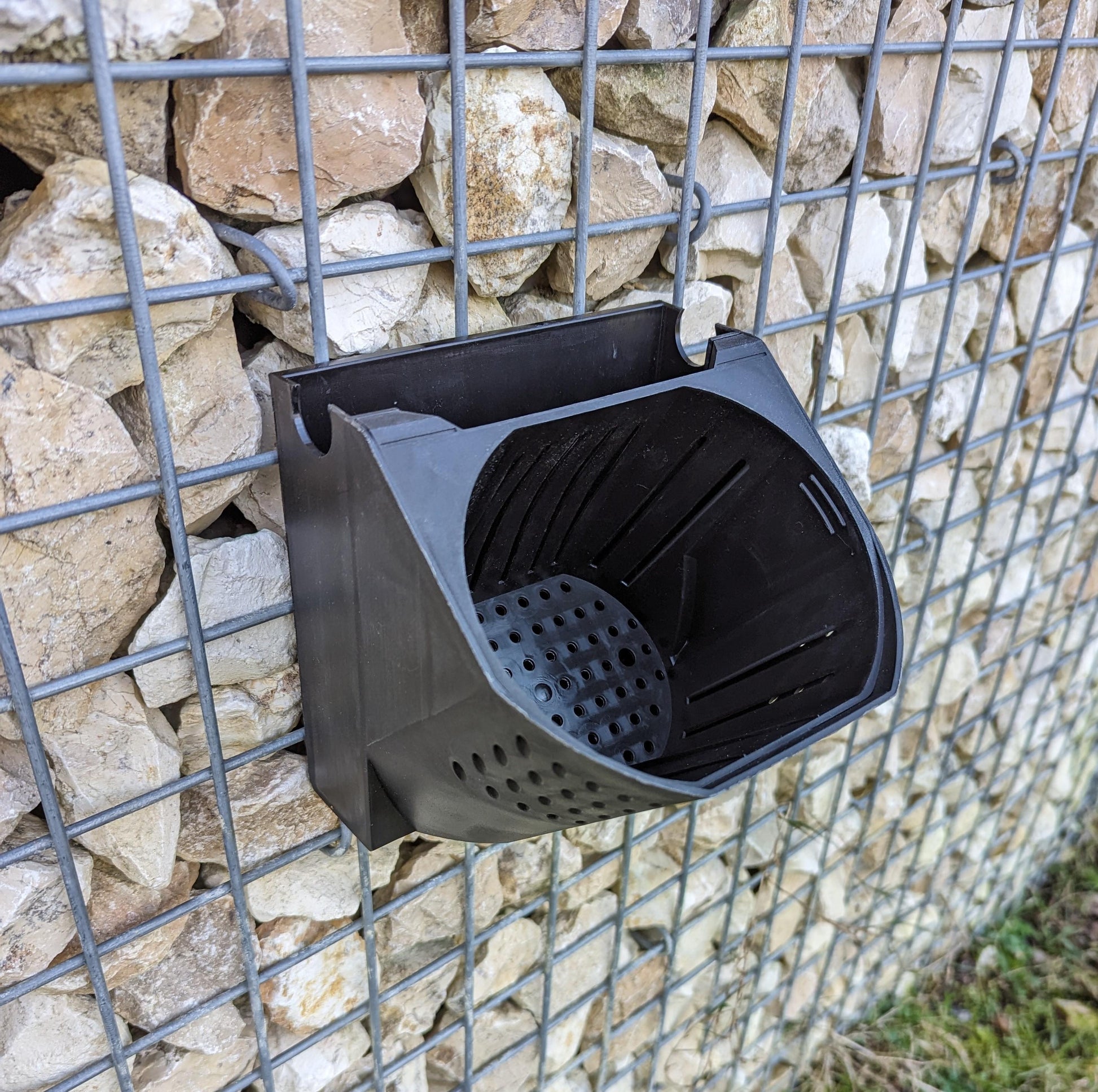 Fixar este vaso de flores ao seu gabião é extremamente simples. O vaso é enganchado na grelha a partir do exterior e fica imediatamente pronto para ser enchido.